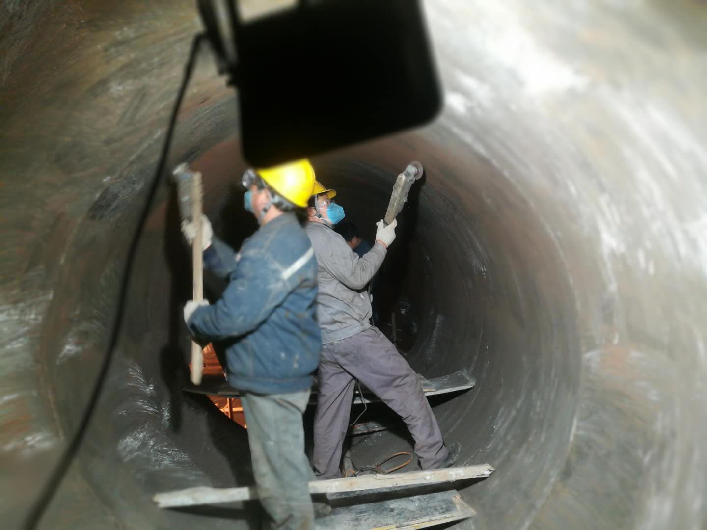 圖(1)脫硫煙道已腐蝕工人正在進(jìn)行粗糙化處理